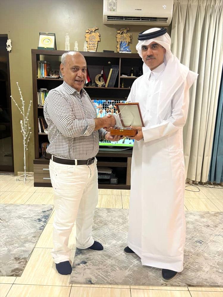 مع احد عمالقة الادارة والاعلام في قطر الحبيبة رجل المواقف النبيلة والنادرة وأحد أبرز الافذاذ على المستووين القاري والدولي نائب رئيس الاتحاد الدولي للصحافة الرياضية الأستاذ القدير محمد حجي وذلك بعد انتهائي من تسجيل حلقة مرئية ومتلفزة في الاستديو الخاص بالزميل بشير سنان لم تر النور حتى الآن يومها أشرت بطريقة منصفة للهامة والقامة الاستاذ محمد حجي ولدوره الفاعل بتكريمي في العاصمة الاردنية عمان خلال العيد ال١١ للصحافة الرياضية العربية.. وما أن عرف الحجي الجميل حتى بادر بالمجيء إلى منزل الزميل بشير سنان وامضينا ثلاثتنا جلسة حميمية ستظل خالدة لعقود قادمة يومها شرفني بدرع صحيفة لويس فيما كان حضوره اكبر تشريف لي شكرا له ولكم ودعواتكم بالشفاء