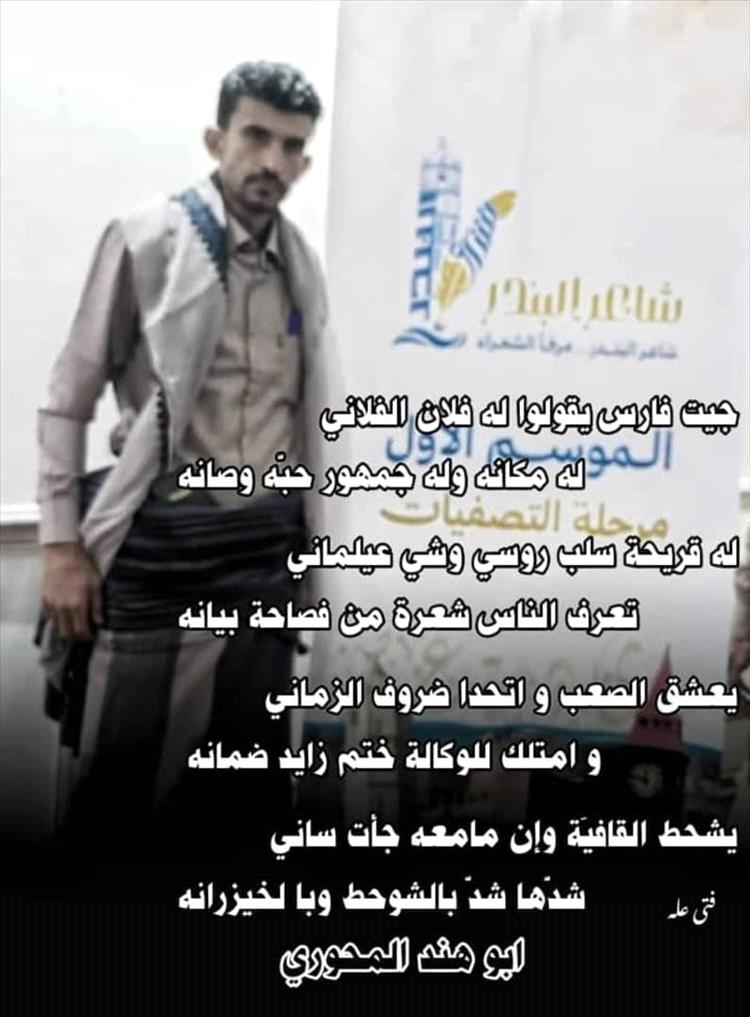 في عالم الشعر، حيث تتدفق الكلمات مثل نهر عذب، يبرز شاعر يملأ الساحة بقصائده، ويترك بصمة لا تمحى في قلوب الناس. إنه أبو هند المحوري، فارس الكلمة والشعر، الذي نافس كبار الشعراء على مستوى اليمن، رغم صغر سنه.*