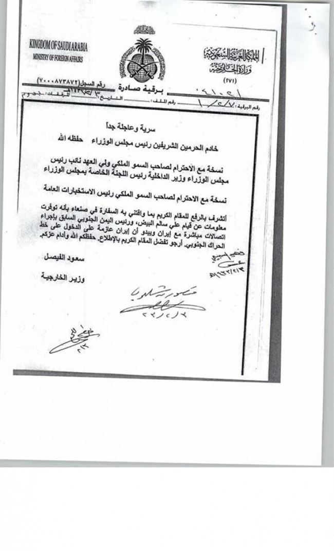 وتتضمن احدى الوثائق المفرج عنها رسالة موجهة من وزير الخارجية السعودية السابق "سعود الفيصل" إلى الملك السعودي السابق "عبدالله بن عبدالعزيز" يبلغه فيها بان السفارة السعودية في صنعاء ابلغته بحصولها على معلومات عن قيام الرئيس الجنوبي السابق "علي سالم البيض" باجراء اتصالات سياسية مع ايران .