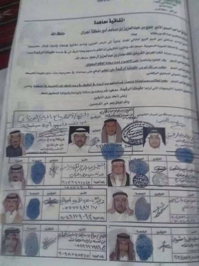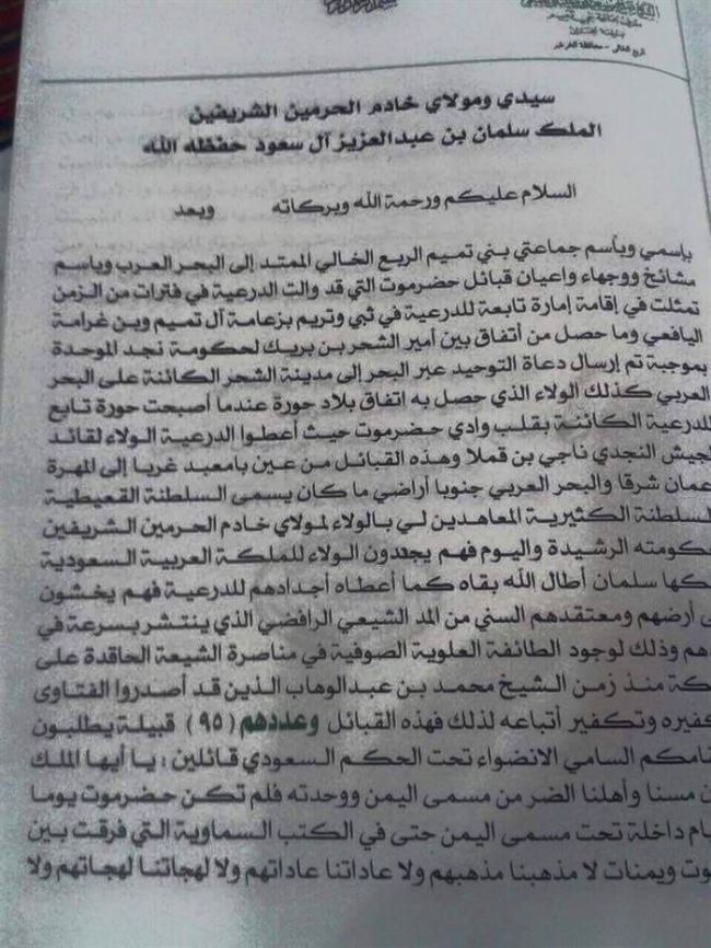 والوثيقة منشورة باسم شيخ سعودي ويدعى الشيخ صالح بن سعيد بن عبدالله التميمي وهو معرفا لبني تميم في منطقة نجران جنوبي المملكة العربية السعودية ويقول فيه انه تلقى مبايعة من عدد من الشخصيات بمحافظة حضرموت و اجزاء من شبوة والمهرة تطالب بضم مناطقها إلى المملكة العربية والتخلي عنها لصالح الاسرة السعودية الحاكمة .