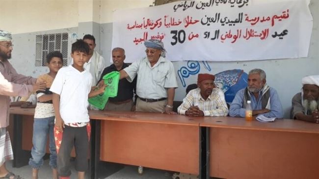 أقامت مدرسة العبيدي صباح اليوم الثلاثاء حفلاً خطابياً وكرنفالي بمناسبة الذكرى الـ51 للثلاثين من نوفمبر المجيد،حيث بُدء الحفل بآي من الذكرى الحكيم بعد ذلك اُلقيت كلمة طلاب المدرسة من قبل الطالب/ علي فضل سمقه التي تطرق فيها لثورة الثلاثين من نوفمبر ودور المنطقة في ثورة التحرر والنضال ضد المستعمر البريطاني، شاكراً في سياق كلمته قيادة مكتب التربية