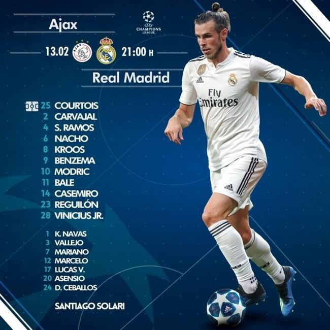 أعلن سانتياجو سولاري المدير الفني لريال مدريد عن تشكيلة فريقه الرسمية التي ستتواجد بعد قليل في أرضية الميدان لملعب “يوهان كرويف أرينا” لمواجهة أياكس في ذهاب دور الستة عشر من بطولة دوري أبطال أوروبا. وأجرى سولاري بعض التغييرات على تشكيلته المعتادة مؤخراً، حيث دفع بالنجم الويلزي جاريث بيل في خط الهجوم بدلاً من لوكاس فاسكيز الذي يقدم أدوار مهمة جداً من الناحية الدفاعية والتكتيكية، بينما سيلعب ناتشو بدلاً من رافاييل فاران الغائب عن لقاء اليوم. وواصل سولاري بوضع ثقته بالمدافع الشاب سيرجيو ريجيلون ودفع به في مركز الظهير الأيسر على حساب مارسيلو الذي سيبقى على دكة البدلاء ماركو أسينسيو ولوكاس فاسكيز. وجاءت التشكيلة على النحو التالي:- حراسة المرمى: تيبو كورتوا خط الدفاع: سيرجيو ريجيلون .. ناتشو.. سيرجيو راموس .. داني كارفاخال خط الوسط: كاسيميرو .. لوكا مودريتش .. توني كروس خط الهجوم: فينيسيوس جونيور .. جاريث بيل .. كريم بنزيما
