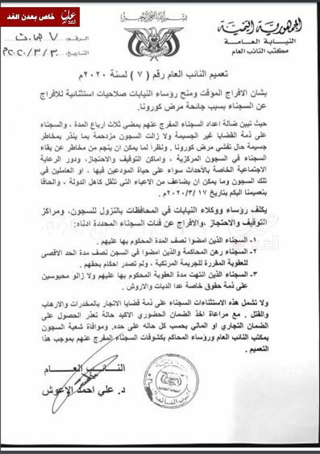 اصدر معالي النائب العام الدكتور.علي احمد الأعوش التعميم رقم (7) لسنة 2020م قضي بمنح رؤساء نيابات الاستئناف في المحافظات صلاحيات استثنائية للإفراح عن السجناء الذين قضوا نصف المدة المحكوم بها عليهم والسجناء رهن المحاكمة الذين امضوا في السجن نصف مدة الحد الاقصى للعقوبة المقررة للجريمة المرتكبة ولم تصدر بحقهم أحكام ، وكذلك الافراج عن السجتاء الذين انتهت مدة العقوبة المحوم بها عليهم ولازالوا محبوسين على ذمة الحقوق الخاصة عدا من هم محبوسين على ذمة الديات والاروش. مع مراعاة أخذ الضمان الحضوري الاكيد حال تعذر الحصول على الضمان التجاري او المالي بحسب كل حالة على حده ، وموافاة شعبة السجون بمكتب النائب العام ورؤساء المحاكم بكشوفات باسماء السجناء المفرج عنهم بموجب هذا التعميم.