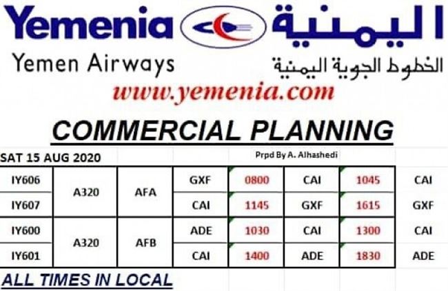 يسير اسطول اليمنية يوم غدا السبت الموافق 15 اغسطس 2020م اربع رحلات جوية. (عدن الغد) ينشر جدول الرحلات: رقم الرحلة: 606. خط الرحلة: سيئون - القاهرة. الاقلاع: 0800 صباحا. الوصول: 1045 صباحا. رقم الرحلة: 607. خط الرحلة: القاهرة- سيئون. الاقلاع: 11:45 ظهرا. (توقيت القاهرة). الوصول: 16:15 مساء. رقم الرحلة: 600. خط الرحلة: عدن - القاهرة الاقلاع: 10:30 صباحا. الوصول: 13:00 ظهرا. رقم الرحلة: 601. خط الرحلة: القاهرة - عدن. الاقلاع: 14:00 ظهرا. (توقيت القاهرة). الوصول: 18:30 مساء.