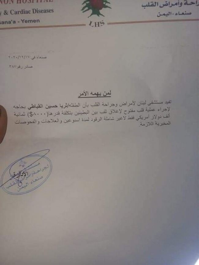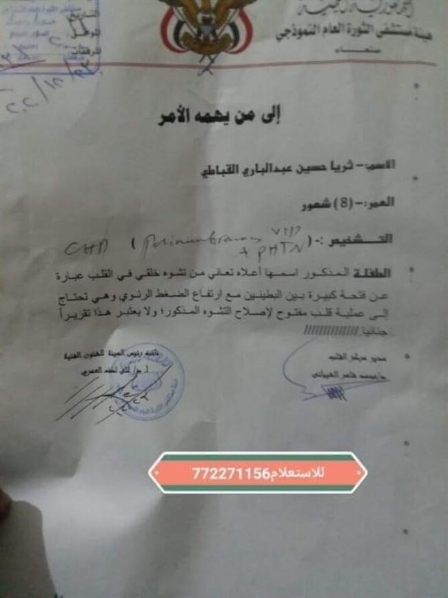 ▪️الملاك / *ثريا حسين عبدالباري مقبل القباطي* (8) اشهر _من ابناء قرية العزيبة- عزلة ظمران - مديرية القبيطة _ *تعاني من تشوه خلقي في القلب عبارة عن فتحة كبيرة بين البطينين مع ارتفاع الضغط الرئوي وتحتاج الى عملية قلب مفتوح مستعجلة لاصلاح هذا التشوه* كما تشير التقارير الطبية المرفقة .▪️وممايجدر الاشارة اليه هنا ان *الظروف المادية لاسرة هذه الملاك غاية في الصعوبة والتعقيد* ، فوالدها عاملا بالاجر اليومي (مهندسا للدرجات النارية ) وقد انهكته مصاريف العلاجية منذ اكتشاف مرضها قبل اكثر من شهرين ، ومن المحال عليه وعلى اسرتها تحمل التكاليف الباهضة لهذه العملية المعقدة وباهضة التكاليف .▪️وبناء على ماسبق فاننا نناشد كل الخيرين والرائعين الاسهام كلا بحسب قدرته وامكانياته لتوفير المبالغ اللازمة لاجراء هذه العملية ، حتى تعود الملاك ثريا باذن الله تعالى سالمة معافاة لوالديها ... همتكم ايها الرائعين وجزاكم الله الخير الوفير ➖➖➖➖➖➖▪️ *التكاليف التقديرية الاجمالية للحملة يمكن تفصيلها كمايلي :1_ تكلفة العملية والرقود لمدة اسبوعين والعلاج والفحوصات مبلغ 8,000 دولار امريكي بحسب عرض السعر المرفق ➖➖➖➖➖➖▪️ *للتواصل والاستفساريمكن التواصل على احد الارقام التالية*1_حسين عبد الباري القباطي/7722711562_علي خالد عبده/7714766863_زكي امين احمد/7302696194_مبارك شاهر /7373324035_عبد الرحمن فارع/7331500056_سند ناجي العبسي /771196232➖➖➖➖➖➖▪️ *للتبرع للملاك ثريا يمكن التوريد الى احد ارقام الحسابات التالية* :1️⃣ في نطاق حكومة صنعاء ( *عملة ورقية قديمة* ) يتم التوريد الى حسابات لدى بنك الكريمي باسم الاخ /*علي خالد عبده* ح- (121346109)ريالح -(222023432)دولارح -(422029654)ريال سعودي .................…...............2️⃣ في نطاق حكومة عدن ( *عملة ورقية جديدة* ) يتم التوريد الى حسابات لدى بنك الكريمي باسم الاخ /زكي امين احمد _ح (121962296 ) ريال يمني