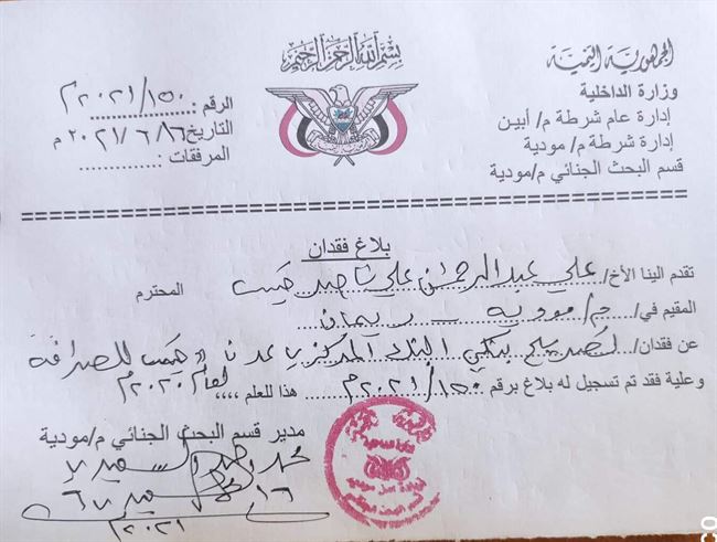 يُعلن المواطن علي عبدالرحمن علي ناصر قيس عن فقدان تصريح بنكي باسم "قيس للصرافة" صادر من  البنك المركزي فرع عدن.