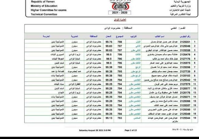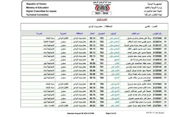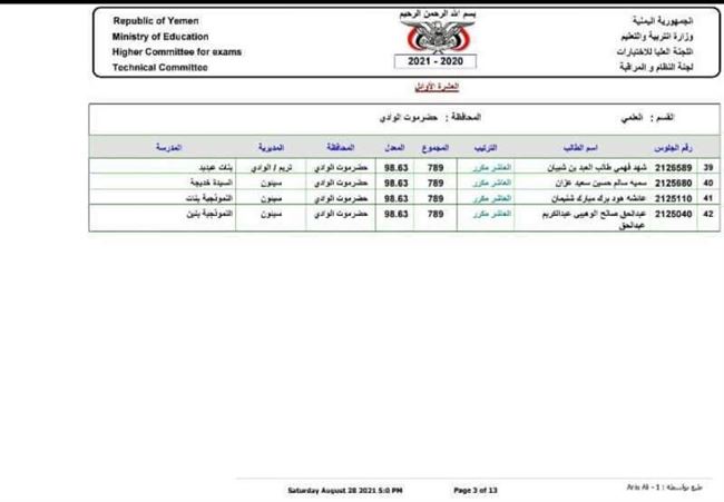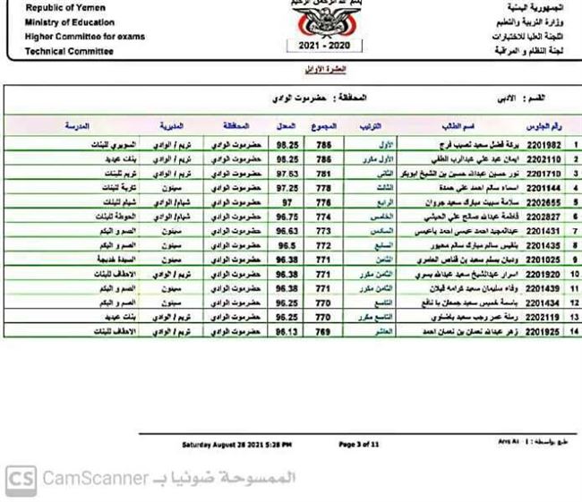 أعلن مكتب وزارة التربية والتعليم بوادي وصحراء حضرموت عن اسماء العشرة الاوائل لإنهاء مرحلة الشهادة الثانوية العامة بقسميها العلمي والادبي للعام الدراسي 2020 ـ 2021م على مستوى مديريات الوادي والصحراء.