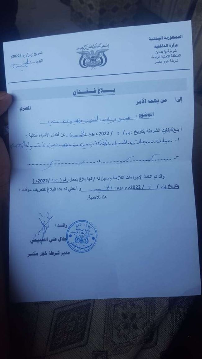 فعلى من يجده يرجى تسليمه إلى أقرب مركز شرطة أو الاتصال على الرقم التالي 738291337 .