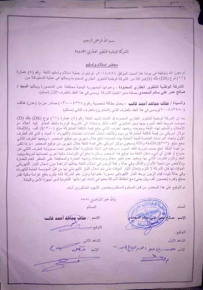 تعلن المواطنة عفاف مجاهد أحمد غالب عن فقدان ملكية شقة في مشروع الشركة الوطنية للتطوير العقاري(مدينة السلام)بمديرية دار سعد وتحمل الشقة رقم 4 لعمارة 11نوع DS"بلكD.