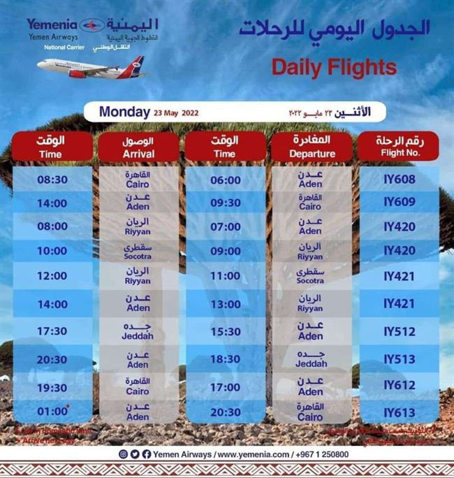 تسير الخطوط الجوية اليمنية، غدًا الإثنين الموافق 23 مايو مطار العاصمة عدن عدد من الرحلات الجوية بحسب الجدول التالي: