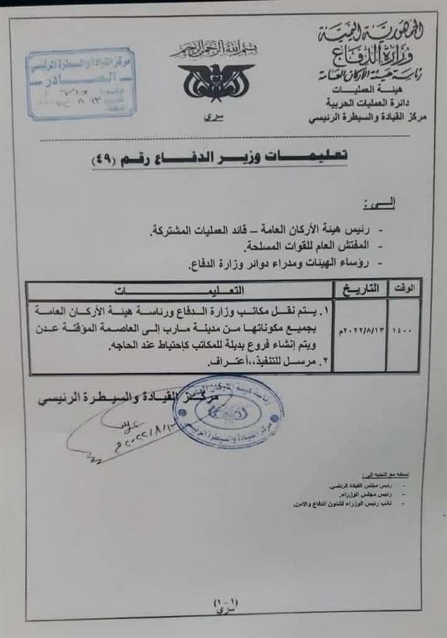 صدر قرار من وزارة الدفاع بنقل مقر وزارة الدفاع من محافظة مأرب الى العاصمة المؤقتة عدن .وكشفت وثيقة صادرة من مركز القيادة والسيطرة الرئيسي في عدن إلى رئيس هيئة الأركان العامة في مأرب بنقل مقر ومكاتب وزارة الدفاع من مأرب إلى العاصمة المؤقتة عدن .وبحسب الوثيقة فأنه سيتم نقل مكاتب وزارة الدفاع ورئاسة هيئة الأركان العامة بجميع مكوناتها من مدينة مأرب إلى العاصمة المؤقتة عدن ويتم إنشاء فروع بديلة للمكاتب كاحتياط عند الحاجة .