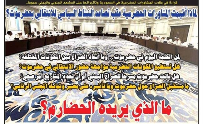 منذ أيام، تستمر المشاورات بين المكونات واقوى الحضرمية المختلفة في العاصمة السعودية، في ظل تسريبات لم تتأكد صحتها بعد بشأن حقيقة ما خرج به المتشاورون هناك، خاصةً وأن المدعوين يمثلون كافة التيارات المتباينة في حضرموت، وهو أمر لافت يدعو للوقوف أمامه.