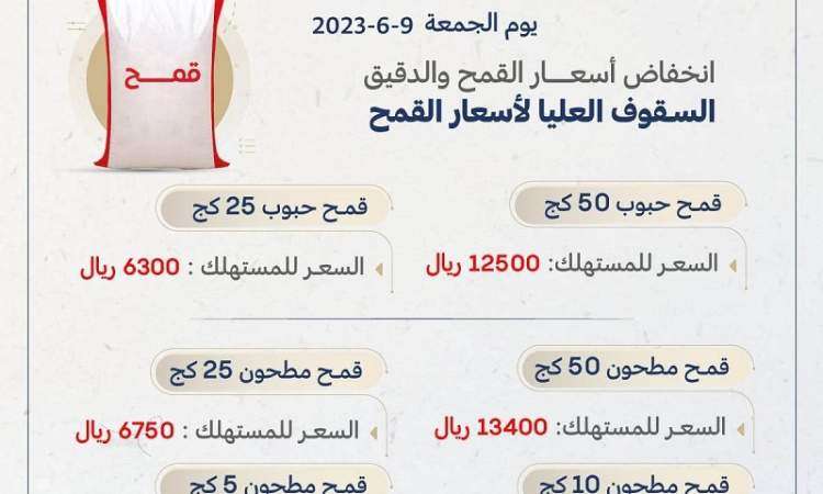 كما جاء في التعميم أن أسعار كيس القمح المطحون 50 كيلو جرام 13400 ريال، وعبوة 25 كيلو جرام بسعر 6750 ريالا وعبوة 10كيلو جرام بسعر 2750 ريالا و عبوة خمسة كيلو جرام بسعر 1400 ريال وسعر الكيلو جرام الواحد 280 ريالا.