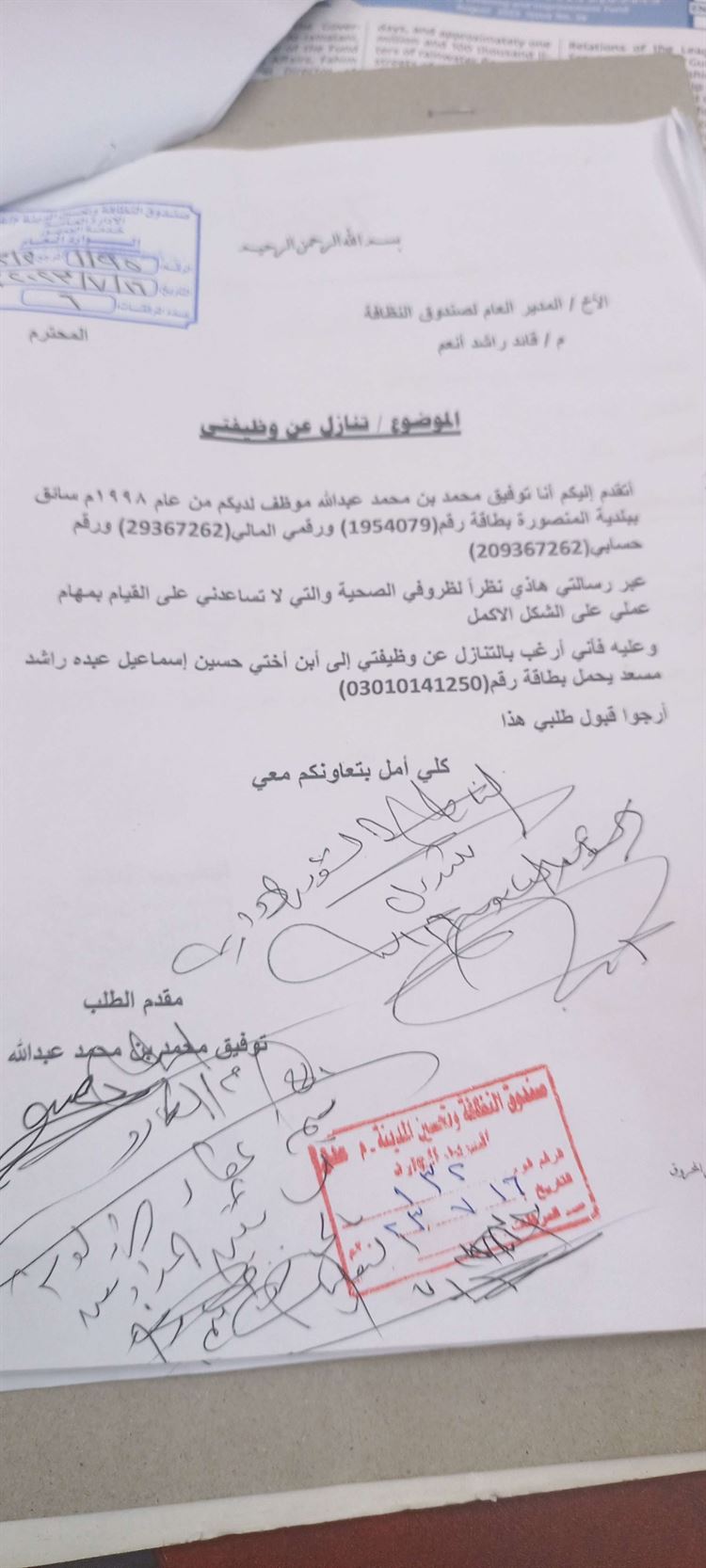 فقد ورد في الخبر أنه تنازل بوظيفته لنجله ، وهذا عاري من الصحة وتدليس على مصداقية موقع عدن الغد والحقيقة أنه كان طلب بنقل وظيفته لنجل شقيقته «نرفق لكم نسخة» وهذا عمل مخالف لن يقوم به صندوق النظافة كون الوظيفة ليس توريث ، وهناك أحقية في التوظيف وهم المتعاقدون في صندوق النظافة وملتزمون في الدوام .