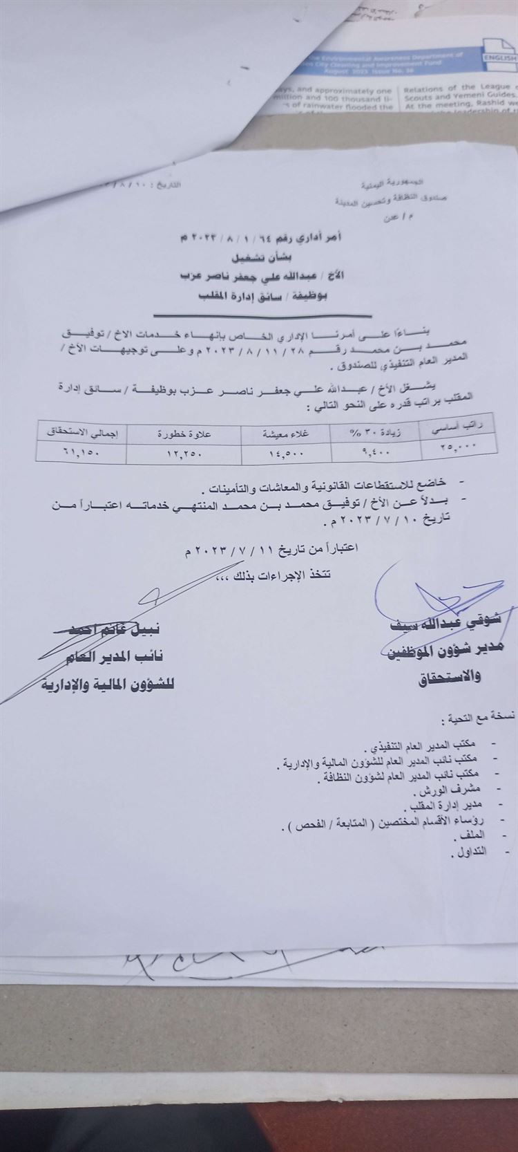 لقد طالعنا موقع "عدن الغد" نشر شكوى فصل الموظف توفيق محمد بن محمد عن عمله واستبداله بشخص آخر، والحقيقة أن إجراءات صندوق النظافة تمت وفق الأطر القانونية وجا طلب الاستغناء عنه بموجب طلب رسمي منه وتمت الإجراءات بموجب النظام والقانون في استبداله بسائق فرامة يعمل في الميدان ومشهود له في الحفاظ على المعدات وملتزم في ساعات الدوام ويقوم بعمله على أكمل وجه، ناهيك عن أن الموظف لديه الكثير من المخالفات في العمل تتمثل بالغياب وعدم التزامه بالدوام ، وقضايا جنائية في إحدى المحاكم سبق وأن تلقينا نسخة منها متهم على ذمة مبالغ مالية كبيرة لأحد الأشخاص وبقي تحت المتابعة من قبل الجهات المختصة مما جعله غير قادر على الالتزام في واجباته بعمل صندوق النظافة .