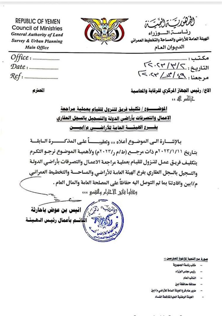 سبق ان وجه انيس باحارثة رئيس الهيئة العامة للاراضي والمساحة والتخطيط العمراني مذكرة رسمية الى هيئة مكافحة الفساد ، يطلب منها توجيه المختصين بالتحقيق في التصرفات التي قام بها مدير فرع الهيئة بابين ونائبه لشؤون السجل العقاري "الموقوفين عن العمل" بعد ان قاموا بصرف ارض الدولة لمشروع ( مدينة الخليج العربي م / ابين ) بالمخالفة للقانون.