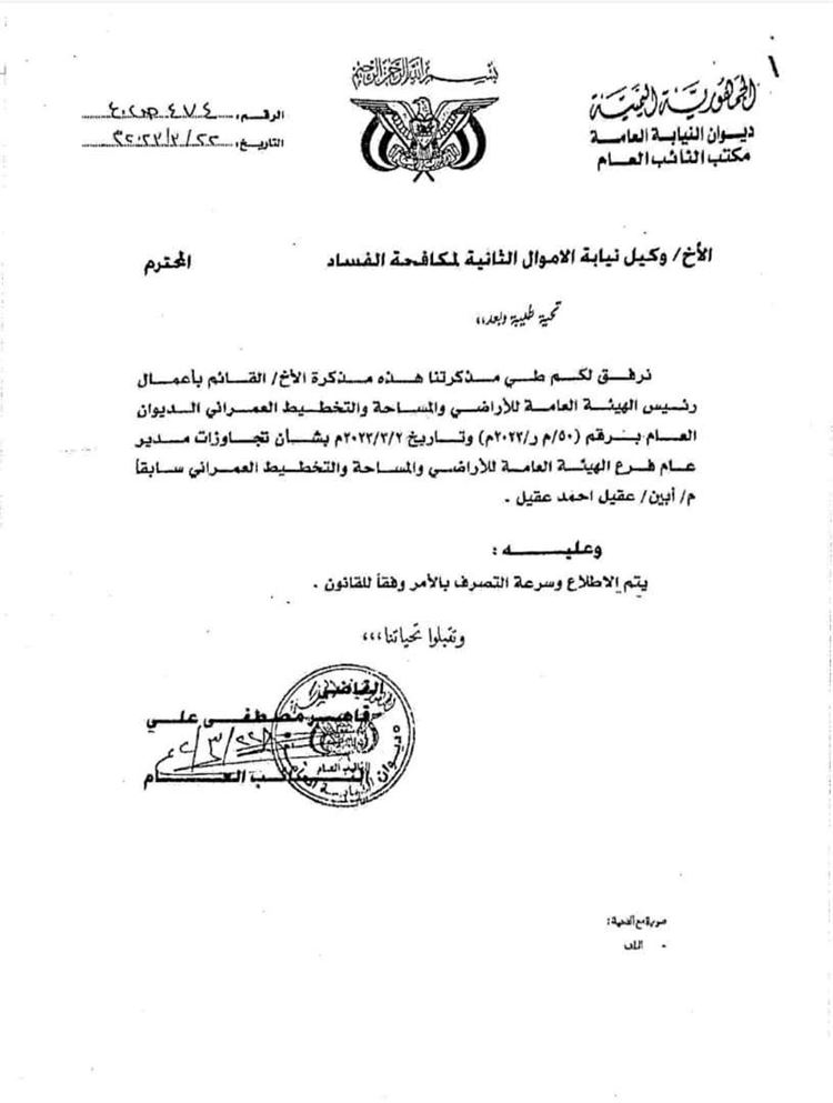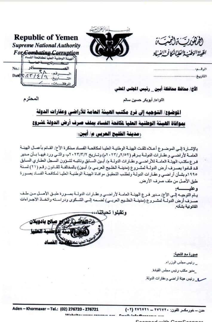 وعلى ضوء شكوى هيئة الاراضي ، بعثت القاضية افراح صالح بادويلان رئيس الهيئة العليا لمكافحة الفساد مذكرة رسمية الى محافظ ابين ( مرفق نسخة منها ) ، طلبت فيها من محافظ ابين توجيه مدير فرع هيئة الاراضي بالمحافظة بموافاتها بصورة طبق الاصل من ملف صرف ارض الدولة لهذا المشروع ، لضمه الى الشكوى ودراسته واتخاذ الاجراءات القانونية بشأنه ، الا انه لم يتم التجاوب مع مذكرة هيئة مكافحة الفساد.