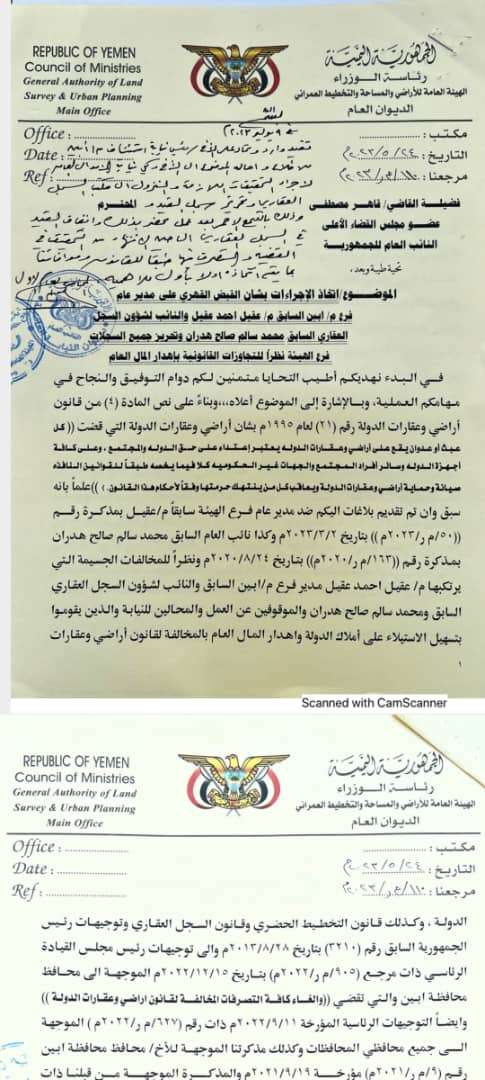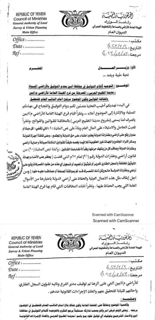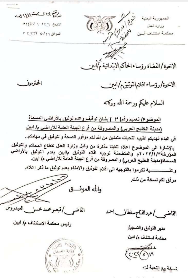 وجه فضيلة القاضي قيصر محمد محسن العيدروس ، رئيس محكمة استئناف محافظة ابين ، تعميما الى رؤساء المحاكم الابتدائية ورؤساء اقلام التوثيق بالمحافظة بعدم توثيق الاراضي المسماة "مدينة الخليج العربي" والمصروفة من فرع هيئة الاراضي بابين.