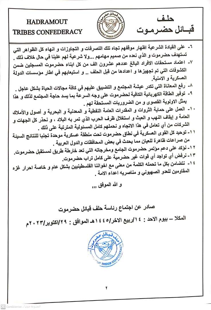 3- نحمل كامل المسئولية دولة الامارات في كافة التجاوزات الحاصلة بحق حضرموت و اهلها , و هم المسئولين عن دعم اجندات سياسية خاصة و فرضها على المجتمع الحضرمي بالمال و قوة السلاح , اضافة الى معاناة المجتمع من ضنك العيش و تردي و انهيار الخدمات الاساسية و منع بعض الصيادين من مزاولة عملهم و ايقاف مطار الريان الدولي عن الخدمة و استخدامه ثكنة عسكرية و التمادي في كل ذلك ينذر بكوارث و صراعات داخل حضرموت نحن حريصون على تجنبها .