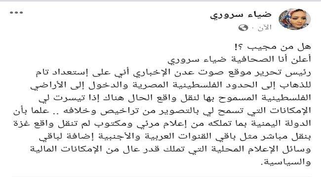 أعلنت الصحافية ضياء سروري رئيس تحرير موقع صوت عدن الإخباري أنها على استعداد تام للذهاب إلى الحدود الفلسطينية المصرية والدخول إلى الأراضي الفلسطينية المسموح بها لنقل وقائع الحرب هناك إذا تيسرت لها الإمكانات التي تسمح لها عملية التصوير من تراخيص وخلافه.