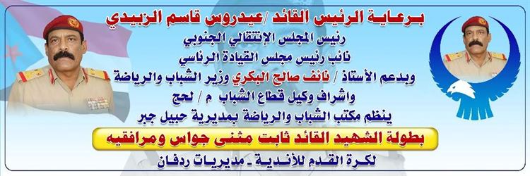 تنطلق غدا الجمعة منافسات بطولة الشهيد القائد ثابت مثنى جواس لكرة القدم بين أندية مديرية ردفان التي تقام على ملعب الشهداء في حبيل جبر ، برعاية اللواء عيدروس الزبيدي وبدعم واشراف من وزارة الشباب والرياضة