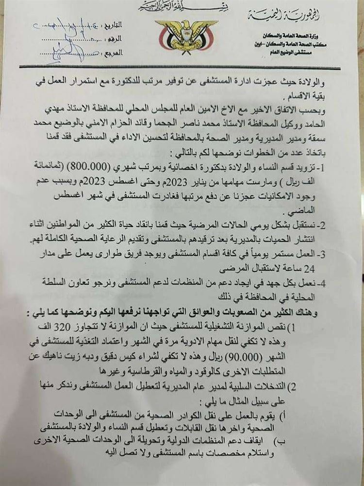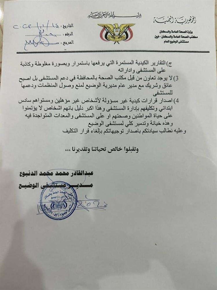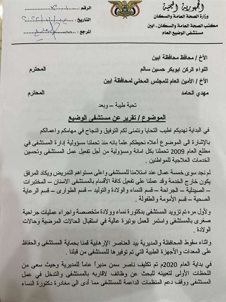 وجه مدير عام مستشفى الوضيع العام بمحافظة أبين الدكتور عبد القادر محمد محمد الدنبوع رسالة هامة ال السلطة المحلية بمحافظة أبين