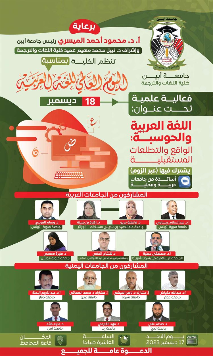 بمناسبة اليوم العالمي للغة العربية نظمت كلية اللغات والترجمة بجامعة أبين فعالية علمية تحت عنوان " اللغة العربية، والحوسبة: الواقع والتطلعات المستقبلية صباح اليوم الأحد بقاعة المحافظ في الجامعة بزنجبار..حضرها د. محمود الميسري رئيس جامعة أبين، ونوابه وعدد من عمداء كليات الجامعة وجمع من المهتمين والكلبة والطالبات.. وبدأت الفعالية بتلاوة آيات من القرآن الكريم لد.عبدالسلام راجح رئيس نقابة التدريس بالجامعة تلته كلمتان مرحبتان بالحاضرين، وكل الدكاترة المشاركين من الوطن ومن خارجه، ومؤكدتان على أهمية الاحتفال باللغة العربية في يوم عرسها العالمي البهيج ، وتجليها الجميل، الأنيق، والاحتفاء بها بما يليق..وبدأ د.ماجد قائد مجلي ينسق ويدير المداخلات عبر الزوم التي تعرض على الشاشة المرئية للدكاترة العرب، وهم د.فاطمة بن جربو من جامعة عبدالحميد بن باديس مستغانم: المغرب،و أ.د. عبدالسلام عيساوي من جامعة منوبة بتونس، وأ.د. مصطفى عطية من الجامعة الإسلامية مينسوتا: أميركا، و د. وسام العريبي من جامعة منوبة بتونس، و د. هشام المكي من جامعة سيدي محمد بن عبدالله بفاس: المغرب، و د. زهرة بن يمينة من جامعة عبدالحميد بن باديس بمستغانم: الجزائر، و د. منيرة محمدي من جامعة منوبة بتونس، وقد حلقت محاضراتهم في سماء صاحبة الجلالة، وأكدت أن اللغة العربية باستطاعتها أن تنتشر أكثر كون الطلب عليها كبيرًا؛ فهي لغة علم، تواصل تواصل حديث، وأن خلفيات التشكيك بها، وبمقدراتها على المواكبة خلفياته معروفة للجميع. و أشارت إلى أهمية النطق الصحيح للألفاظ، وتجنب النطق الخاطئ، وأكدت أهمية التصويب اللغوي الذي وُضعت له كتب تعنى بموضوعه مثل " التوفق "للجوزي، وغيره، وأن من الأهمية بمكان تصحيح وتصويب كل ما يتحدث به العرب، والناطقون بالعربية حرصًا على سلامة اللغة ونقائها وصفائها.و رأى البعض أن اللغة العريية يواجهها تحدٍّ حضاريٌّ كبيرٌ أمام اهتمام الدول الكبرى بلغاتها اهتمامًا متعاظمًا.. حيث تصعد دع صعودهم مثلًا تطور حضارة الغرب، وازدهار معها لغاتها الانجليزية والفرنسية والألمانية، وكذا بالنسبة للغات الصينية واليابانية والأسبانية وغيرها.. فكل حضارة تصعد معها لغتها.. ويبرز السؤال هنا.. إين نحن من هذا التحدي الحضاري الكبير؟! فاليهود أحيوا لغتهم العبرية، وأعادوها إلى الحاضر بقوة، وألزموا الطلاب والمعلمين والمثقفين والباحثين بضرورة التحدث بها.. اي الأبحاث تكون بالعبرية ثم تُترجم الى الانجليزية والفرنسية وغيرهما. ولغتنا العربية تعاني الغربة بين أهلها..وقد ارتبطت اللغة العربية مؤخرًا بالرقمنة والعلوم الحاسوبية في محاولة جادة للتكيف والتفاعل مع مستجدات العصر.. وكانت الخطوات إيجابية حيث تتجه الجهود لرقمنة كل رسائل الماجستير والدكتوراة العربية ومعظم النتاجات الفكرية.. وتتكون بذلك هناك مداخل كثيرة للبرامج الحاسوبية.. باللغة العربية.وانتهت المداخلات من الجامعات العربية ثم انتقل ميكرفون إدارة الجلسة لد. صالح الشاجري العولقي رئيس قسم اللغة العربية في كلية التربية بزنجبار ليدير الجلسات، وبدأت تتالى مداخلات الدكاترة من عدد من الجامعات اليمنية بدءًا بمداخلة أ. د. عبدالله أحمد مكياش من كلية الآداب بجامعة عدن، ود. صدام علي حسين من جامعة لحج، ود. ماجد قائد مجلي من كلية التربية بزنجبار من جامعة أبين، وأ. مشارك د. ناصر العيشي من جامعة شبوة، وأ. د فهد الفارمي من جامعة إب، وأ. د. عبد الكريم البحلة من جامعة ذمار، وأ. مشارك د. محمد الصماتي،و أبرزت مداخلاتهم أهمية اللغة العربية ومكانتها بين اللغات.. وعلاقاتها باللغات الأخرى مثل اللغات السامية التي أرجع د. مكياش أصلها إلى اليمن.. إلى العربية، وعد اليهود أن العرب ضد الشعوب السامية والساميين، وهم أخطأوا بهذا الاتهام.. وهناك مفردات كثيرة بين العربية والعبرية.. مثلًا هلك في العربية تعني ذهب إلى الموت، وفي العبرية.. هلك.. يمعنى ذهب الطالب إلى المدرسة، وسجد في العربية تعني الخضوع والخ