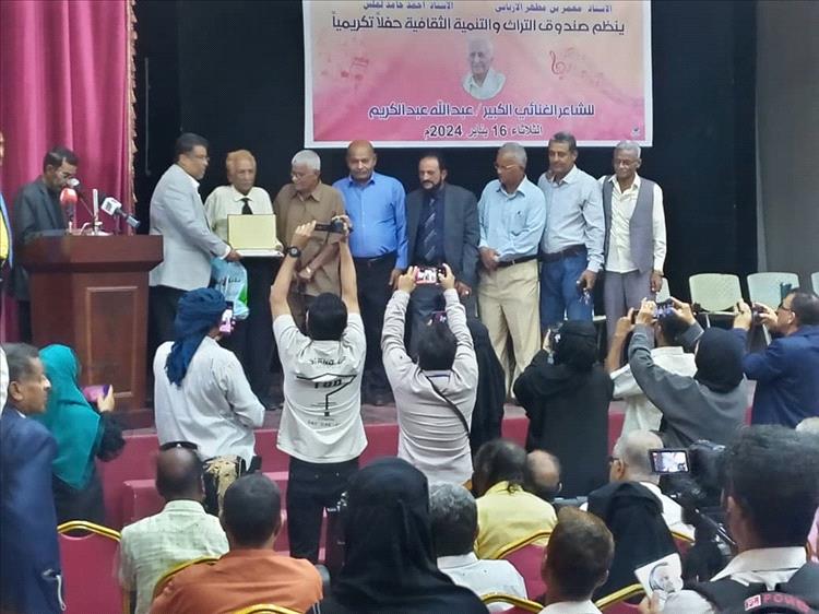 ما ميز الاحتفاء بالشاعر عبدالله عبدالكريم، تلك الألفة الفنية، التي أحاطت به من قبل الفنانين ومنهم الفنان الكبير محمد محسن عطروش والموسيقار احمد بن غوذل والفنانة أمل كعدل والفنان نجيب سعيد ثابت، الى جانب الاحتفاء به من شخصيات رسمية وجمهور ردد كلمات اغانيه، التي قدمها ثلاثة من الشباب، مع فرقة موسيقى محافظة عدن، في حين كان الفنان المسرحي فؤاد هويدي، وهو يقدم فقرات حفل التكريم، يضغط ويشد على الكلمات، محتفيا وتأكيدا على مكانة الشاعر.;