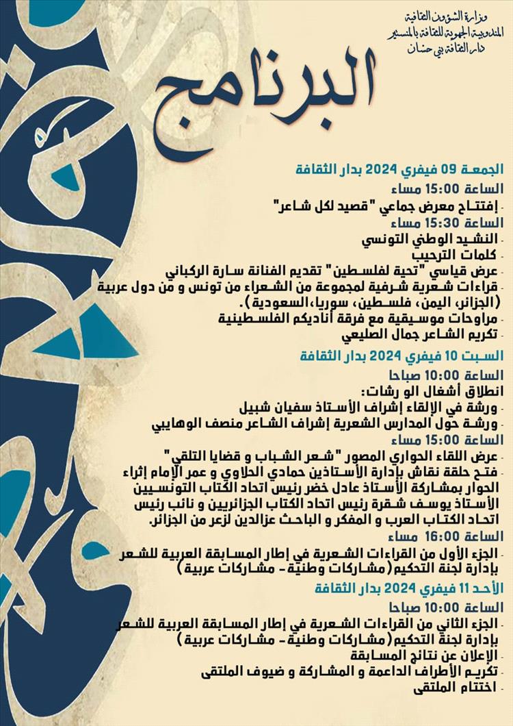;;;;; تنظم دار الثقافة بالمنستير (بني حسان) بتونس الدورة (17) من الملتقى العربي للشعراء الشبان، وذلك بين التاسع الى الحادي عشر من شهر فبراير 2023 بعنوان " شعر الشباب وقضايا التلقي" بمشاركة عربية متميزة من الجزائر واليمن وفلسطين وسوريا والسعودية.