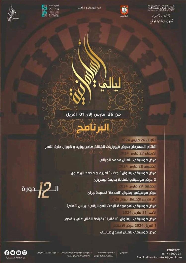تنطلق بإذن يوم غد; فعاليات الدورة الثانية عشرة لمهرجان ليالي السليمانية; من 26 مارس الجاري إلى غاية الأول من; إبريل2024 بدار الثقافة السليمانية وسط العاصمة تونس بإشراف المندوبية الجهوي للشؤون الثقافية بتونس و بدعم من المؤسسة الوطنية لتنمية المهرجانات الثقافية و الفنية و ادارة الرقص و الموسيقى و بلدية تونس و النادي الثقافي علي بلهوان .