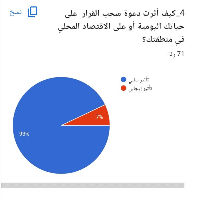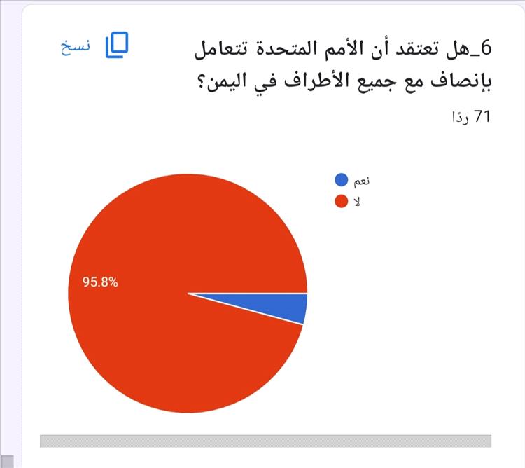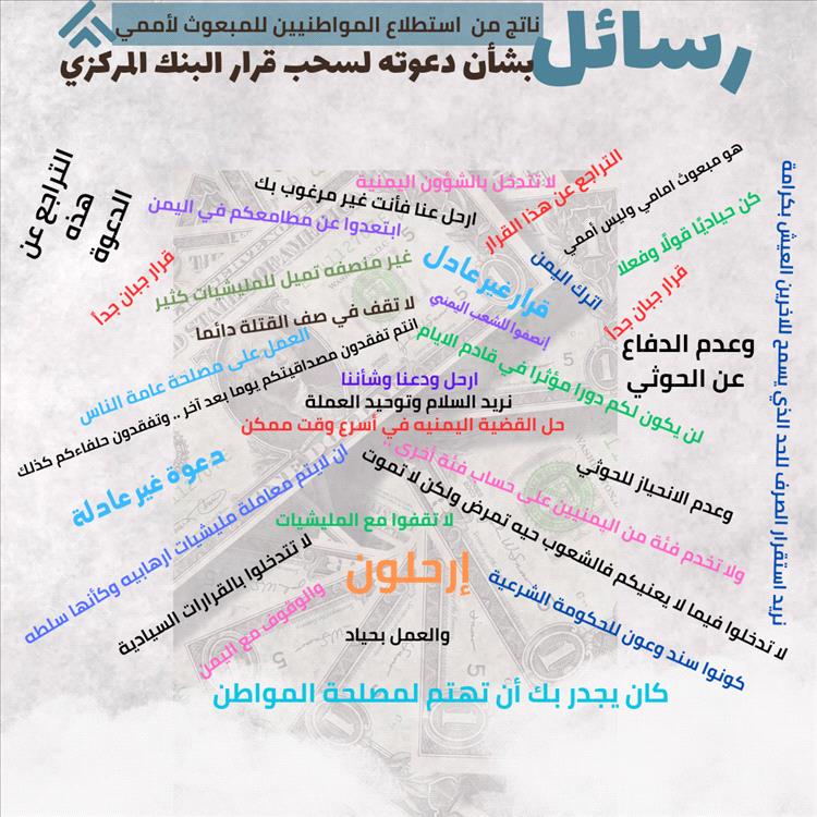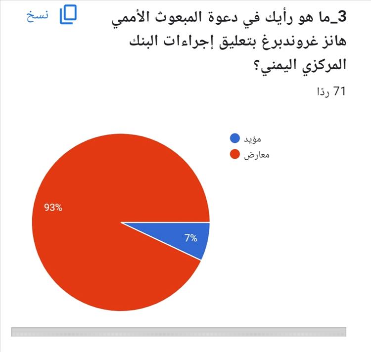 وفي استطلاع إلكتروني شارك فيه 71 مواطنًا ومواطنة من مختلف المناطق اليمنية، حيث كانت نسبة المشاركات من الإناث 54.4% ومن الذكور 45.6% جغرافياً، كانت 79.4% من المشاركات من مناطق سيطرة الحكومة الشرعية و20.6% من مناطق سيطرة جماعة أنصار الله الحوثيين ، أظهر الاستطلاع أن 92.6% من المشاركين يعارضون دعوة المبعوث الأممي هانز غروندبرغ بتعليق إجراءات البنك المركزي اليمني، ويرون أن لها تأثيرًا سلبيًا على حياتهم اليومية والاقتصاد المحلي، يعتقد 92.6% من المشاركين أن الدعوة ستؤدي إلى تصعيد الأوضاع الاقتصادية، بينما يرون 95.6% أن الأمم المتحدة لا تتعامل بإنصاف مع جميع الأطراف في اليمن. بالإضافة إلى ذلك لا يعتقد 73.5% من المشاركين أن هناك دورًا إيجابيًا يمكن أن تلعبه الأمم المتحدة في حل الأزمة الاقتصادية ، الرسائل للمبعوث الأممي تضمنت دعوات للتراجع عن الدعوة ، ودعم الشرعية، والتعامل بحيادية، مع انتقادات لدور الأمم المتحدة في دعم جماعة الحوثي.