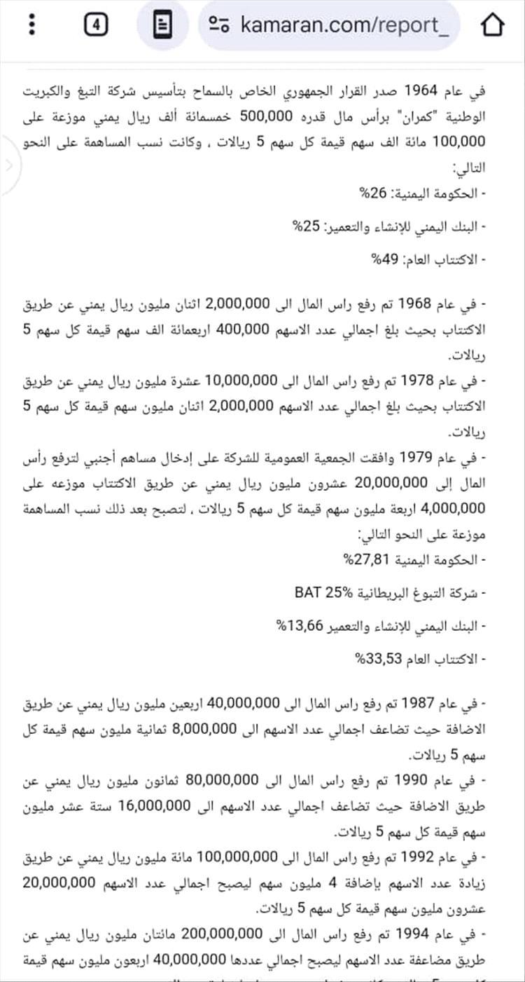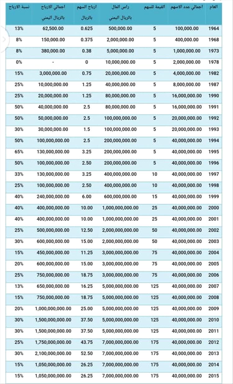 *-كانت ارباح الشركة قد بلغت مابين 40% إلى 65% مابين الاعوام 1991م والعام 1995م وبراسمال قدرة 80 مليون و200 مليون فقط العام 1995م ، بيمنا اليوم رأسمال الشركة العامل 7 مليار ريال يمني ، بارباح اخر سنه 2017م ، لم تتجاوز 7% ، وهذه الارقارم تعطي صغار ومتوسطي المساهمين الحق بالتساؤلات بعد ضياع المليارات ، ويلزم القانون رئيس مجلس الإدارة والاعضاء تلبيتها ولا يحق لهم رفضها واخفاءها لاي سبب كان وسيظهر المخفي والغش والطلبات هي:*