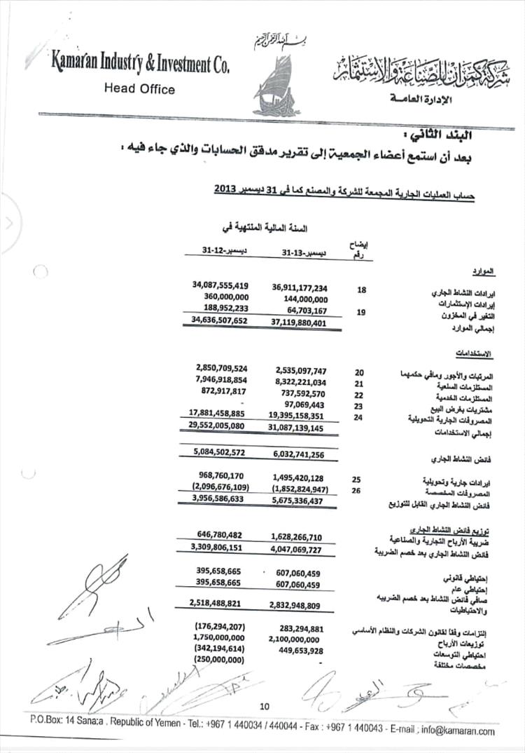 *متوسط أرباح الشركة سنويا نحو 100.000.00 ريال يمني ، بمعنى السبع سنوات 700.000.000 ريال يمني ، وهذا يبدو أنه الهدف الخفي وراء إعلان المساهمين لإقرار الميزانية لسبع سنوات مرة واحدة ، كون الإدارة تحصل على 10% من صافي ارباح الشركة مقابل الادارة ، رغم انهم يستلمون رواتب شهرية عالية ، ومكافآت وحوافز سنوية مجزية وهذا مخالف للقانون لانهم جمعوا بين بدلين ، فالنسبه لرئيس ومجلس الإدارة هي بدل مقابل ادارتهم ، ولا يحق لهم رواتب ، وهنا يتبادر السؤال : السبع سنوات تعاقب عليها ثلاثة رؤساء مجلس إدارة ، ورابعهم كان قبلهم ، فكيف تحصل الإدارة الحالية على نصيب ثلاث فترات رئاسية للشركة؟*