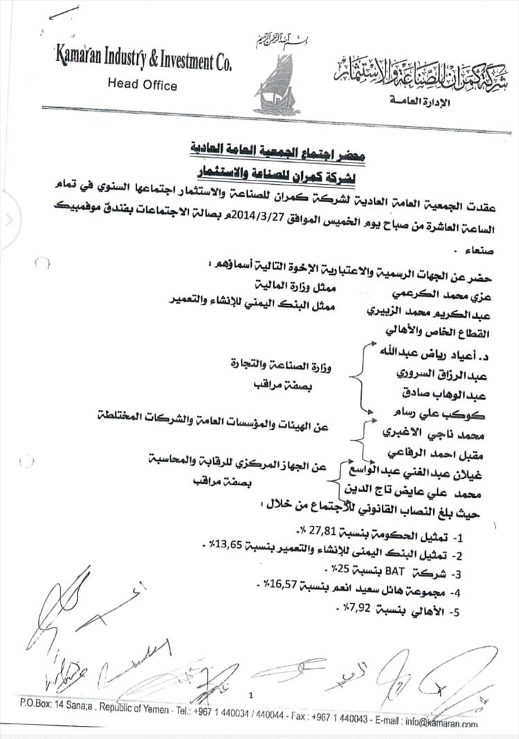 *-هنا سوف يتضح اين ذهبت أموال الشركة والمساهمين ، لأن الإدارة ومجلسها الموقر من كبار المساهمين ، هم من تسببوا في ضياع أموال مساهمين الشىركة الصغار والمتوسطين وتفويت الأرباح عليهم ، مما قد يتسبب في إفلاس الشركة ، وذهابها للتصفية والبيع لكبار المساهمين والمنافسين ، ولا يستبعد ان تستحوذ الشركة البريطانية للتبغ المساهمة ب25% من رأسمال الشركة على الجمل بما حمل تحت إدارة لا تعرف الفرق بين الموازنة والميزانية العمومية وتختزلها في عدة وريقات ، وخاصة أن نسبة الشركة البريطانية بطبيعة الحال قد ارتفعت فهي لا تستلم ارباحها السنوية ، وقد تصل لاكثر من 50% في غضون سنوات قادمة ، فصمت الشركة البريطانية مريب ، وبالخصوص انها المورد الوحيد والاحتكاري لمستلزمات صناعة شركة كمران للسجائر ، وبامكان الشركة باي وقت مستقبلا رفع اسعار المواد الخام بالترافق مع التلاعب والفساد في إدارة شركة كمران وخسائرها المحتملة مستقبلا كأحد أكبر المساهمين وتستحوذ على مجمل شركة كمران للصناعات والاستثمار بتراب الفلوس ، فالشركة البريطانية العالمية للتبع لا يعقل ان سكوتها المريب عما يحدث من فقدان للأموال النقدية خصوصاً وترك أرباحها تنمو مع راسمالها عفوي وبرئ ، وهي ايضا المورد الاحتكاري للمصنع ، فهل يعقل انها سوف تترك 25% المساهمة الأساسية لها للشارع اليمني !*
