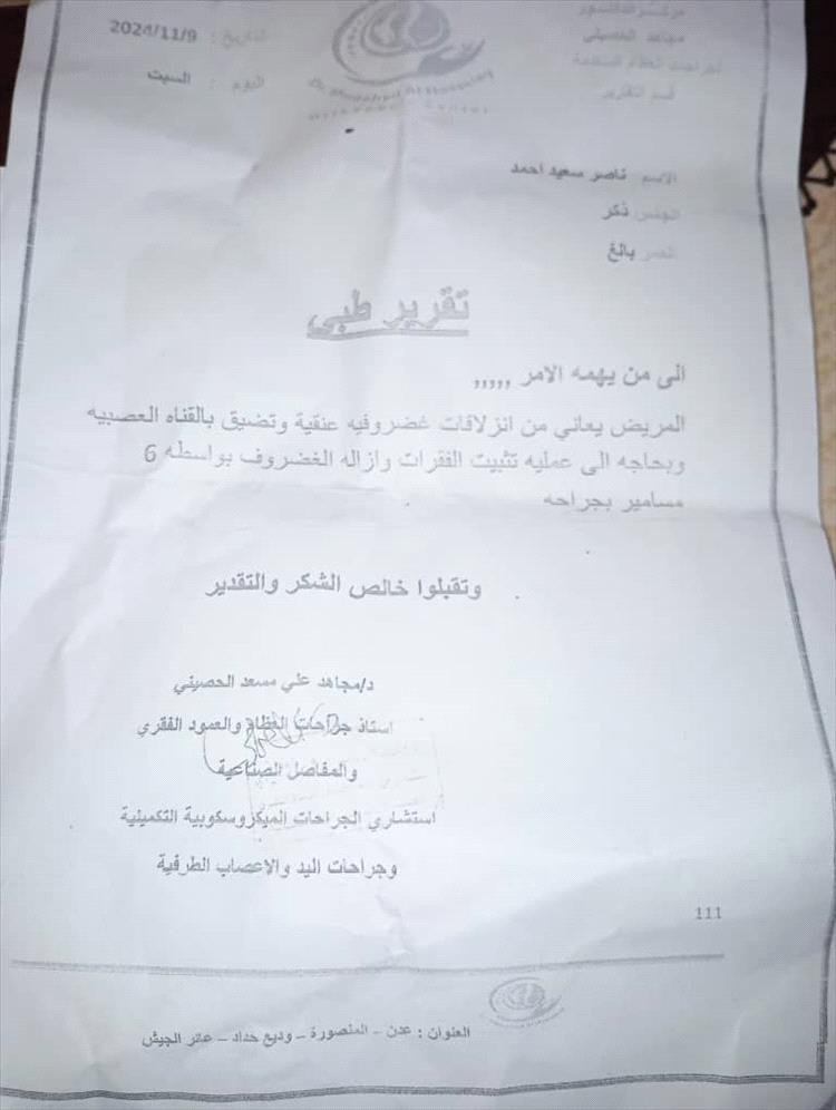 وهو بحاجة الى عملية تثبيت الفقرات وازالة العضروف بواسطة 6 مساميربجراحة تحت عناية الاستشاري الدكتور مجاهد الحصيني