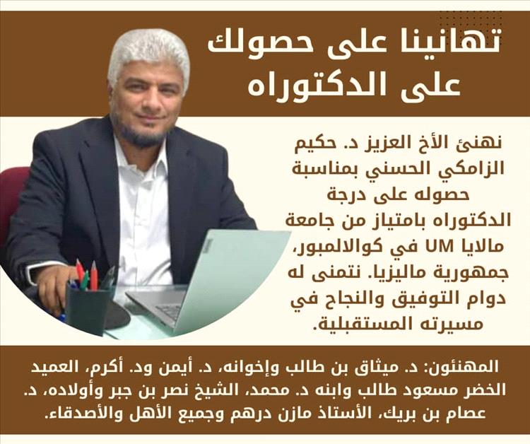 نهنئ الأخ العزيز د. حكيم الزامكي الحسني بمناسبة حصوله على درجة الدكتوراه بامتياز من جامعة مالايا UM في كوالالمبور جمهورية ماليزيا. نتمنى له دوام التوفيق والنجاح في مسيرته المستقبلية.