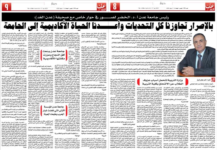 وحتى نضع النقاط على الحروف، وحتى لا نضيع دور من كان لهم الفضل الكبير في النهوض بالعملية التعليمية، وفتح أفق كبيرة، وإنجازات ملموسة في نهوض وتطوير الجامعة، وجعلها في مصاف الجامعات الخارجية.. أجرينا في صحيفة (عدن الغد)، حواراً صحفياً مع أ. د. الخضر ناصر لصور- رئيس جامعة عدن، الذي فتح لنا نوافذ الردود على كل ما عرض عليه من أسئلة واستفسارات، وكان صريحاً وواضحاً في طرحه للإجابات.