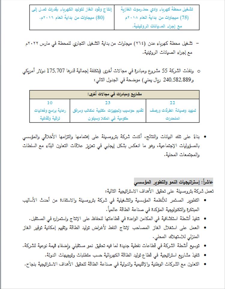 كما بادرت الشركة في دعم الجهات الحكومية والسلطات المحلية لمواجهة بعض الحالات الطارئة مثل إحتواء تسرب كميات من المازوت الناتج عن حادثة جنوح السفينة شامبيون على ساحل المكلا عام 2013م وكذلك مكافحة وباء كورونا عام 2020م، والإسهام في التخفيف من آثار فيضانات السيول وإطفاء الحرائق في المجتمعات المحلية وإنقاذ مصابين في حوادث سير على الخطوط العامة القريبة من مواقع العمل.