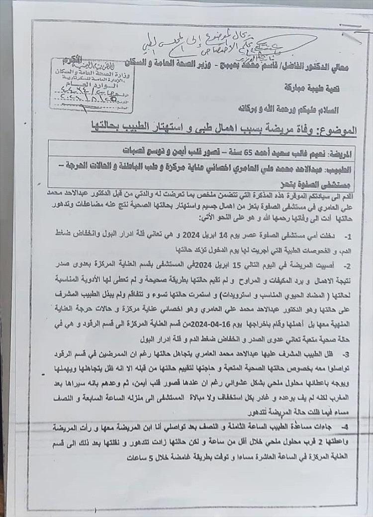 وأضاف أن إهمال الطبيب كان السبب الرئيسي في وفاة والدته بتاريخ 17/4/2024، وذلك بسبب عدم قيام الكادر الطبي بواجباتهم ومسؤولياتهم الكاملة تجاهها كمريضة.