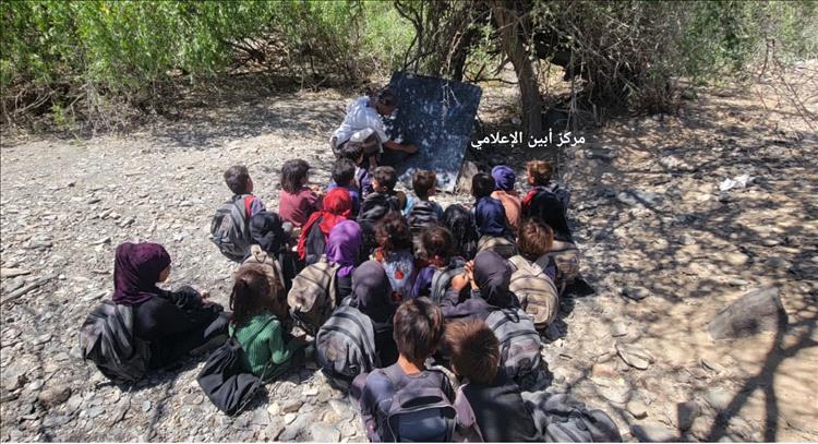 حيث لجأ القائمون على المدرسة لإستقبال الطلاب تحت ظلال عدد من أشجار السمر بمحيط القرية .
