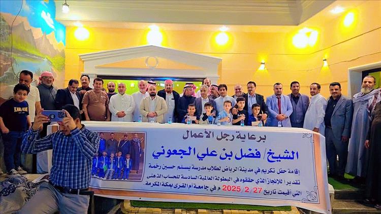 احتفى رجل الأعمال اليمني الشيخ فضل بن علي الجعوني مساء أمس الجمعة ،في حفل خاص بمقر إقامته في الرياض، بالطلاب اليمنيين الفائزين في المسابقة العالمية للحساب الذهني (ماث - كيدز) بنسختها العالمية السادسة، التي أقيمت مؤخراً في المملكة العربية السعودية، بمشاركة أكثر من 450 طالب وطالبة من خمس دول عربية هي الجزائر وتونس وسوريا والعراق.
