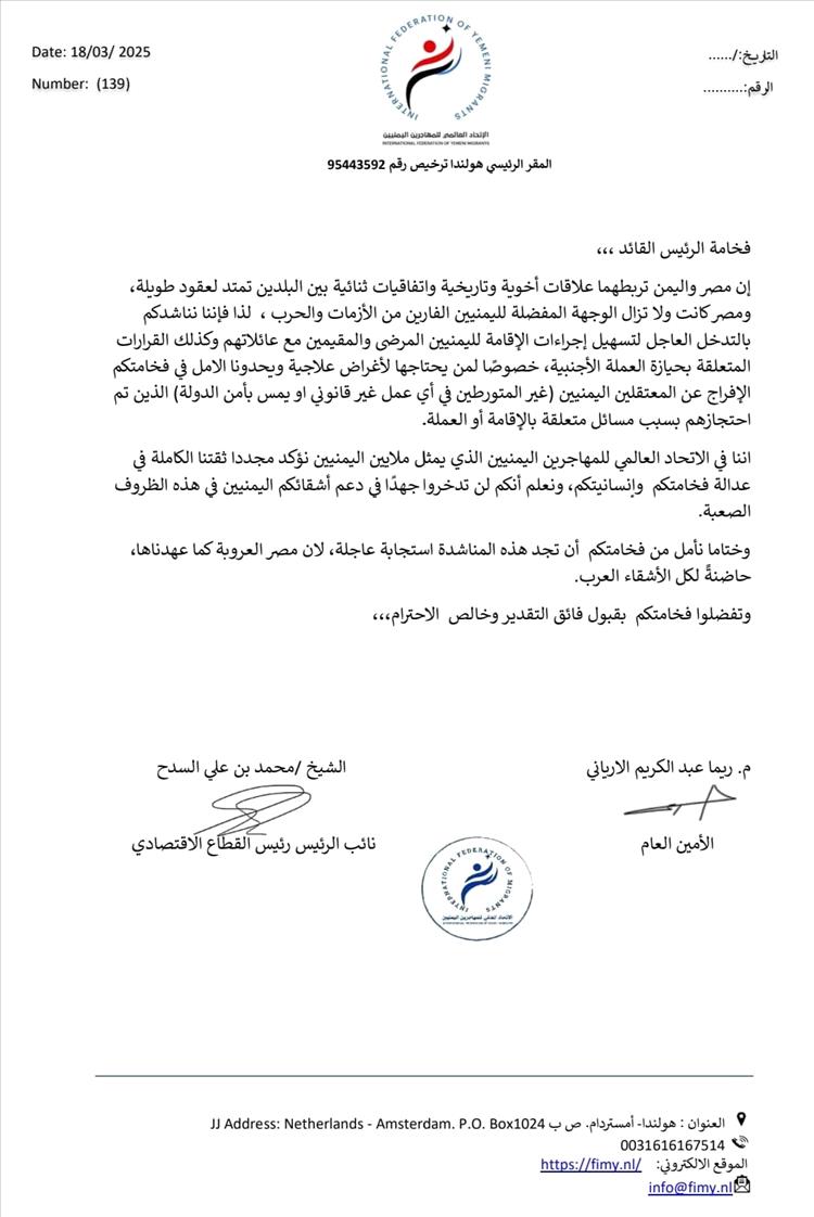 نتوجه إليكم بهذه المناشدة العاجلة باسم الإتحاد العالمي للمهاجرين اليمنيين حاملين آمال وتطلعات مئات آلاف من اليمنيين المقيمين في مصر، الذين طالما وجدوا في بلدكم العزيز الأمن والأستقرار في ظل قيادتكم الحكيمة بسبب الظروف الصعبة التي تمر بها بلادنا.
