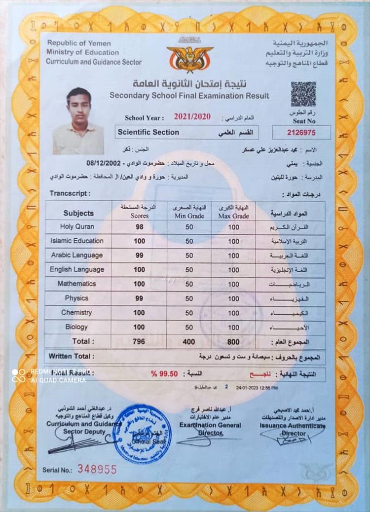 وقال الطالب محمد عسكر، في رسالة تلقتها الصحيفة، إنه تخرج من ثانوية حورة بمحافظة حضرموت – القسم العلمي – بنسبة 99.50% للعام الدراسي 2020-2021، محققًا المركز الثالث على مستوى المحافظة، كما حصل على الترتيب الثاني عشر في امتحانات المفاضلة للمنح الدراسية عام 2022.