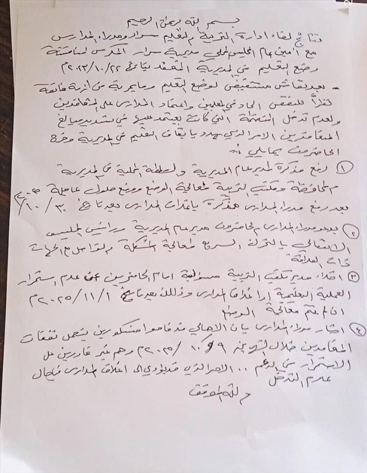إخلاء مدير مكتب التربية مسؤوليته أمام الحاضرين عن أي تبعات تتعلق بتوقف العملية التعليمية أو إغلاق المدارس بعد 1 نوفمبر 2025، إن لم تتم معالجة الوضع.