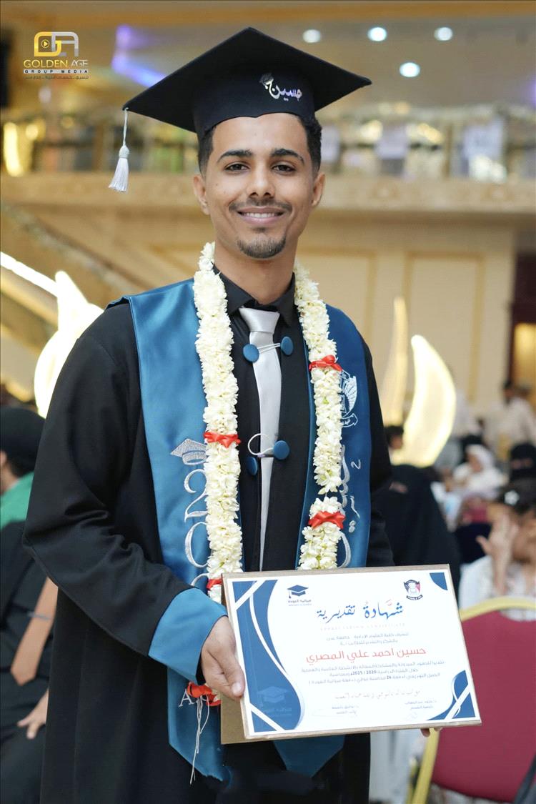 أتقدم بأزكى آيات التهاني والتبريكات القلبية الى الأخ الحبيب الشاب" حسين أحمد علي المصري" بمناسبة تخرجه من كلية العلوم الإدارية قسم المحاسبة في جامعة عدن.