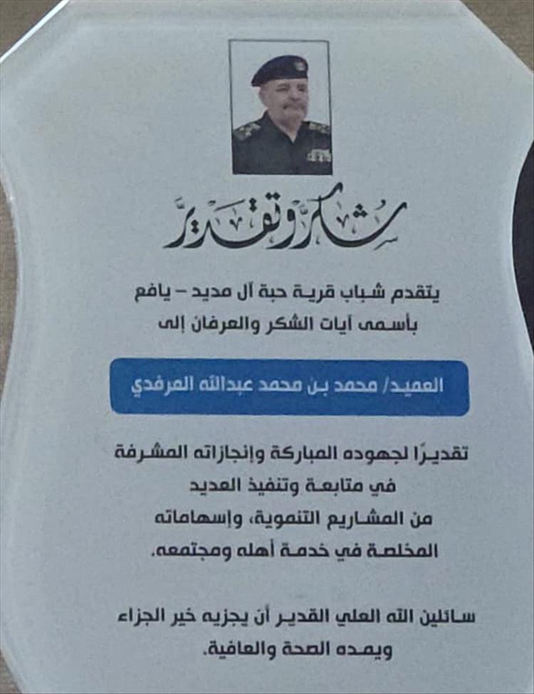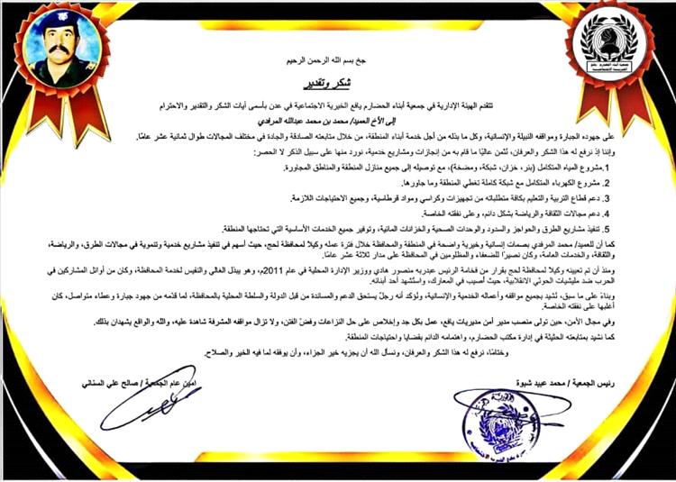 كما أشادت الجمعية بدوره في تعزيز الأمن والاستقرار أثناء توليه مهام مدير أمن مديريات يافع، وجهوده المخلصة في حل النزاعات القبلية، ومتابعته الدؤوبة لقضايا مكتب الحضارم واهتمامه الدائم باحتياجات المنظمة والمجتمع المحلي.