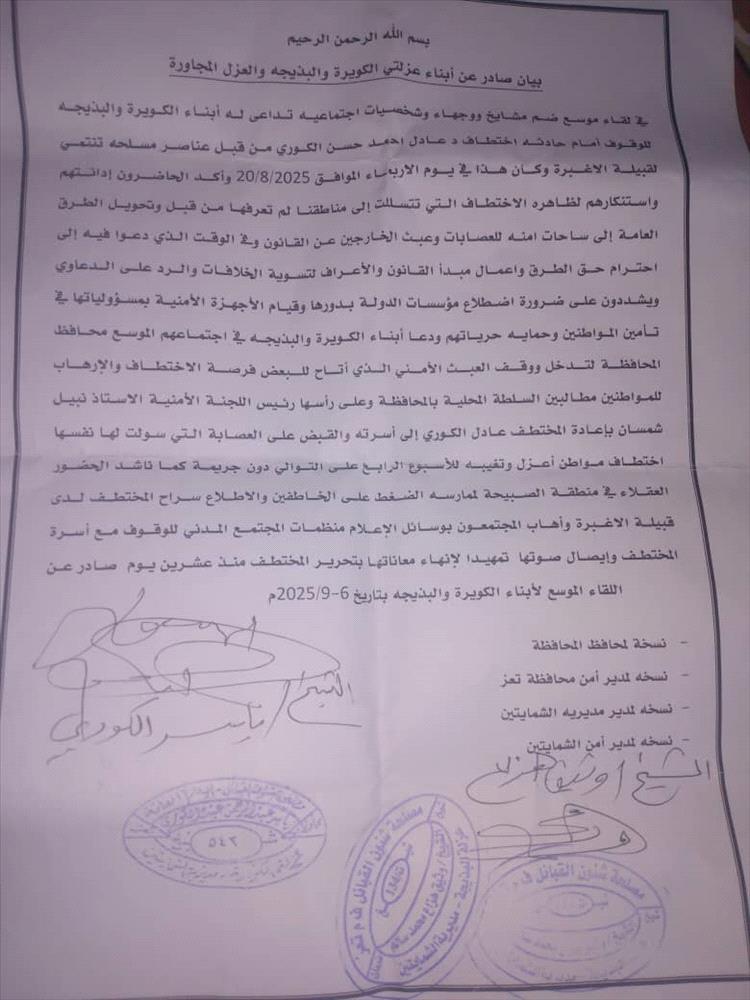 ناشد الاخ علي احمد حسن الكوري النائب العام للافراج عن شقيقه عادل احمد حسن الكوري الذي تم اختطافه في منطقة حشفين الزعازع مديرية الشمايتين م تعز يوم الاربعاء 2025/8/20 م من قبل عصابة مسلحة .