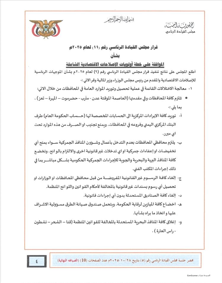 أقر مجلس القيادة الرئاسي القرار رقم (11) لعام 2025م، بشأن الموافقة على خطة أولويات الإصلاحات الاقتصادية الشاملة، الهادفة إلى معالجة الاختلالات المالية والإيرادية وتوحيد الموارد العامة في البنك المركزي اليمني.