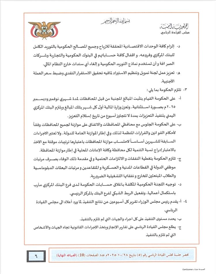 وبحسب الوثائق الرسمية، فإن الخطة التي بدأ تنفيذها اعتبارًا من 28 أكتوبر 2025م، تلزم السلطات المحلية والمحافظين بإيداع كافة الإيرادات في الحسابات الحكومية المركزية لدى البنك المركزي اليمني، ومنع أي رسوم أو استقطاعات غير قانونية. كما شددت على منع التدخل في أعمال المنافذ الجمركية، وإخضاع جميع الإيرادات والجبايات للإجراءات الرسمية المنظمة.
