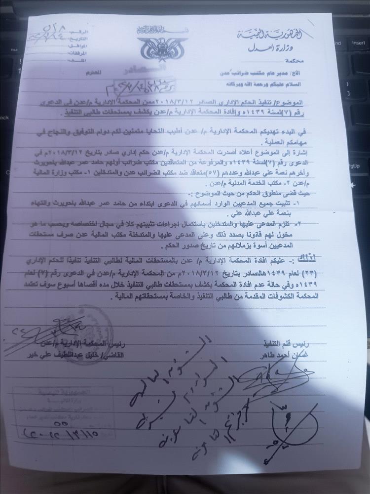 وأكدوا أنهم كمتعاقدين في مكتب ضرائب عدن حصلوا على حكم قضائي صادر عام 2018م يقضي بالتثبيت للمتعاقدين، ومع ذلك ما زال تنفيذ الحكم معطل دون مبرر بينما تُخصص الوظائف لجهات أخرى على حساب حقوقهم القانونية، وحيث أن اغلب المتعاقدين لهم أكثر من 10 سنوات بالتعاقد.